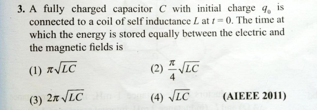 A fully charged capacitor C with initial charge q 0 is connected to a coil of self inductance L at t = 0. The time at which the energy is stored equally between the elrctric and the magnetic fields is A fully charged capacitor C with initial charge q 0 is connected to a coil of self inductance L at t = 0. The time at which the energy is stored equally between the elrctric and the magnetic fields is October 24, 2020 Category: Uncategorised (JEE Advanced Physics by BM Sharma + GMP Solutions) , Facebook Messenger WhatsApp Share this:TwitterFacebook Related