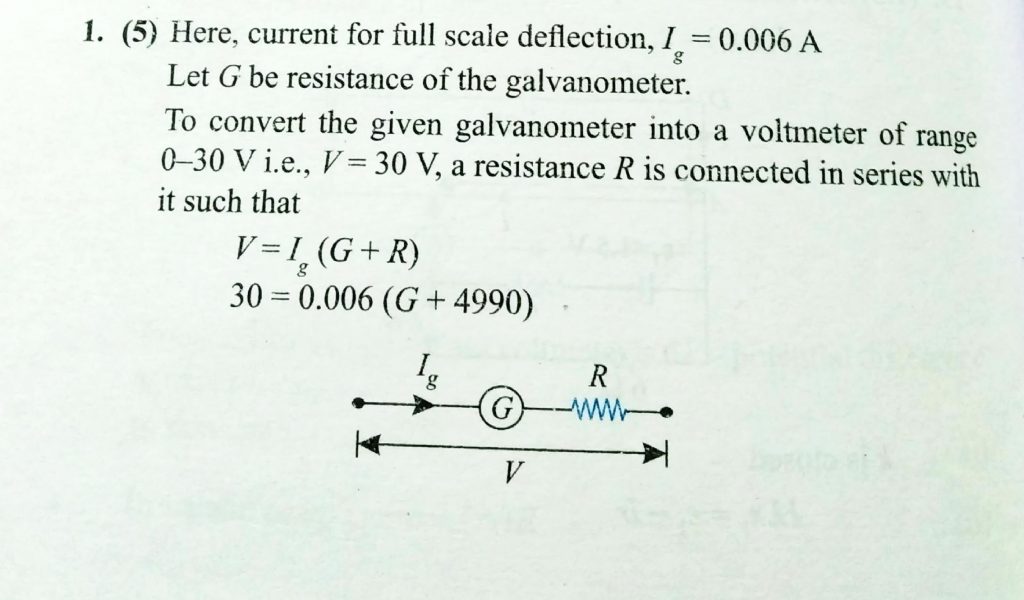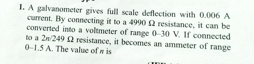 A galvanometer gives full scale deflection with 0.006 A current. By connecting it to a 4990 Ω resistance, it can be converted into a voltmeter of range 0.30 V. If connected to a 2n/249Ω resistance, it becomes an ammeter of range 0−1.5 A. the value of n is