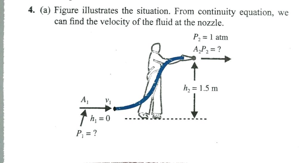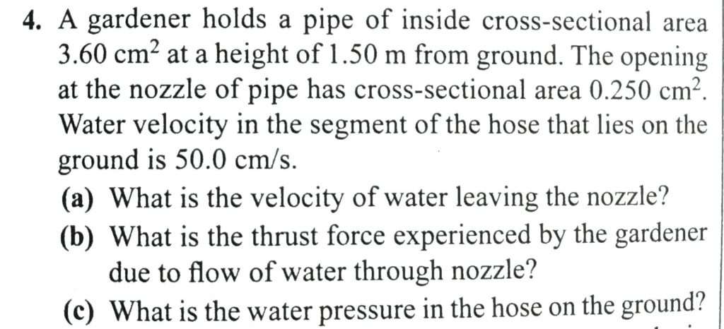 A gardener holds a pipe of inside cross-sectional area 3.60 cm^2 at a height of 1.50 m from ground. The opening at the nozzle of pipe has cross-sectional area 0.250 cm^2. Water velocity in the segment of the hose that lies on the ground is 50.0 cm/s. a. What is the velocity of water leaving the nozzle? b. What is the thrust force experienced by the gardener due to flow of water through nozzle. c. What is the water pressure in the hose on the ground?