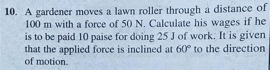 A gardener moves a lawn roller through a distance of 100 m with a force of 50 N. Calculate his wages if he is to be paid 10 paise for doing 25 J of work. It is given that the applied force A gardener moves a lawn roller through a distance of 100 m with a force of 50 N. Calculate his wages if he is to be paid 10 paise for doing 25 J of work. It is given that the applied force October 2, 2020 Category: Uncategorised (JEE Advanced Physics by BM Sharma + GMP Solutions) , Facebook Messenger WhatsApp Share this:TwitterFacebook Related