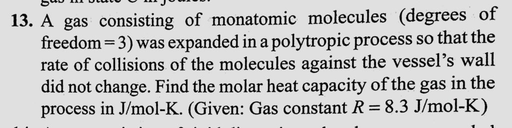 A gas consisting of monatomic molecules (degrees of freedom = 3) was expanded in a polytropic process so that the rate of collision of the molecules against the vessel’s wall A gas consisting of monatomic molecules (degrees of freedom = 3) was expanded in a polytropic process so that the rate of collision of the molecules against the vessel's wall October 29, 2020 Category: Uncategorised (JEE Advanced Physics by BM Sharma + GMP Solutions) , Facebook Messenger WhatsApp Share this:TwitterFacebook Related