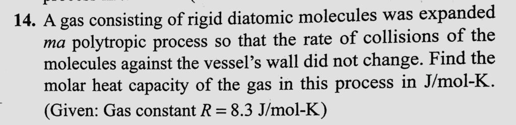 A gas consisting of rigid diatomic molecules was expanded ma polytropic process so that the rate of collision of the molecules against the vessel’s wall did not change. Find the A gas consisting of rigid diatomic molecules was expanded ma polytropic process so that the rate of collision of the molecules against the vessel's wall did not change. Find the October 29, 2020 Category: Uncategorised (JEE Advanced Physics by BM Sharma + GMP Solutions) , Facebook Messenger WhatsApp Share this:TwitterFacebook Related