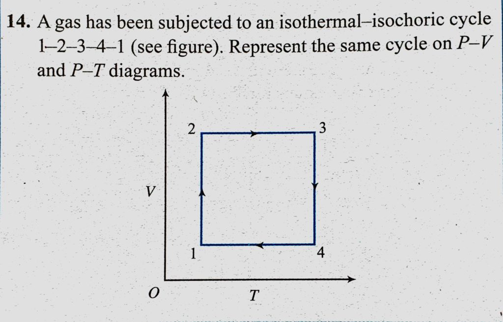 A gas has been subjected to an isothermal-isochoric cycle 1-2-3-4-1 (see figure). Represent the same cycle on P-V and P-T diagrams. A gas has been subjected to an isothermal-isochoric cycle 1-2-3-4-1 (see figure). Represent the same cycle on P-V and P-T diagrams. October 27, 2020 Category: Uncategorised (JEE Advanced Physics by BM Sharma + GMP Solutions) , Facebook Messenger WhatsApp Share this:TwitterFacebook Related