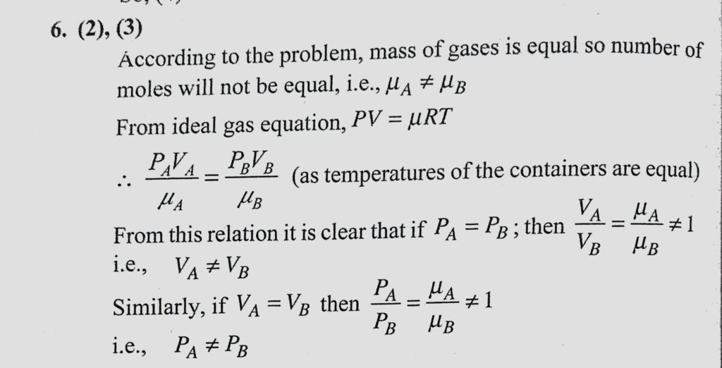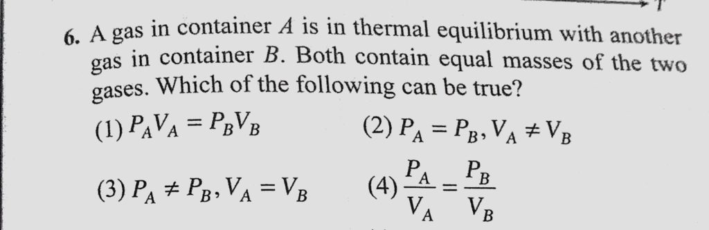A gas in container A is in thermal equilibrium with another gas in container B. Both contain equal masses of the two gases. Which of the following can be true ? A gas in container A is in thermal equilibrium with another gas in container B. Both contain equal masses of the two gases. Which of the following can be true ? October 27, 2020 Category: Uncategorised (JEE Advanced Physics by BM Sharma + GMP Solutions) , Facebook Messenger WhatsApp Share this:TwitterFacebook Related
