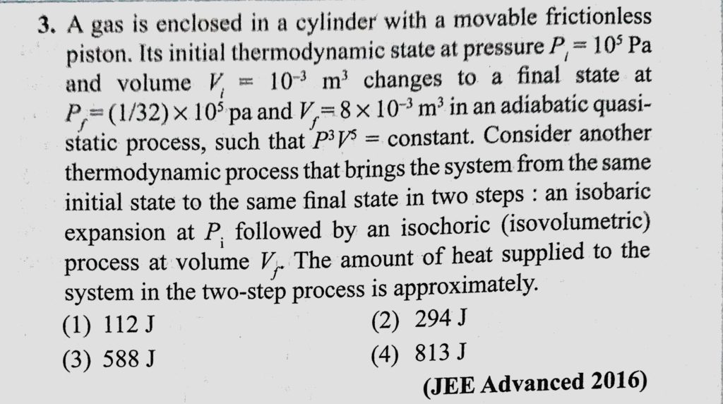 A gas is enclosed in a cylinder with a movable frictionless piston. Its initial thermodynamic state at pressure P1 = 10^5 Pa and volume Vi = 10^-3 m^3 changes to a final state at A gas is enclosed in a cylinder with a movable frictionless piston. Its initial thermodynamic state at pressure P1 = 10^5 Pa and volume Vi = 10^-3 m^3 changes to a final state at October 30, 2020 Category: Uncategorised (JEE Advanced Physics by BM Sharma + GMP Solutions) , Facebook Messenger WhatsApp Share this:TwitterFacebook Related