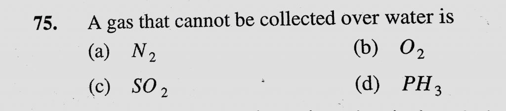 A gas that cannot be collected over water is (a) N2 (b) O2 (c) SO2 (d) PH3 A gas that cannot be collected over water is (a) N2 (b) O2 (c) SO2 (d) PH3 November 27, 2020 Category: Uncategorised (JEE Advanced Physics by BM Sharma + GMP Solutions) , Facebook Messenger WhatsApp Share this:TwitterFacebook Related