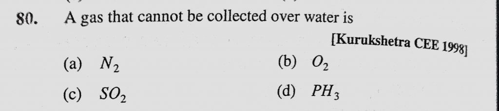A gas that cannot be collected over water is (a) N2 (b) O2 (c) SO2 (d) PH3 A gas that cannot be collected over water is (a) N2 (b) O2 (c) SO2 (d) PH3 November 23, 2020 Category: Uncategorised (JEE Advanced Physics by BM Sharma + GMP Solutions) , Facebook Messenger WhatsApp Share this:TwitterFacebook Related