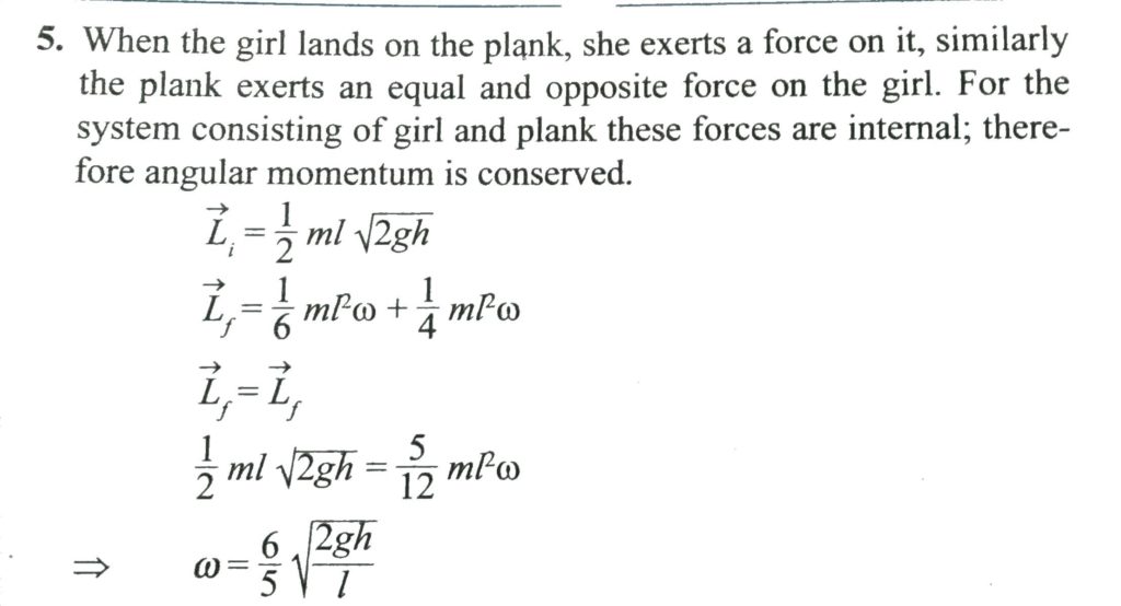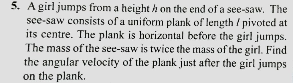 A girl jumps from a height h on the end of a see-saw. The see-saw consists of a uniform plank of length I pivoted at its centre. The plank is horizontal before the girl jumps. The mass of the see-saw is twice the mass of the girl. Find the angular velocity of the plank just after the girl jumps on the plank.