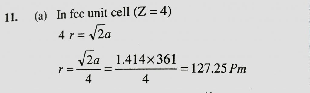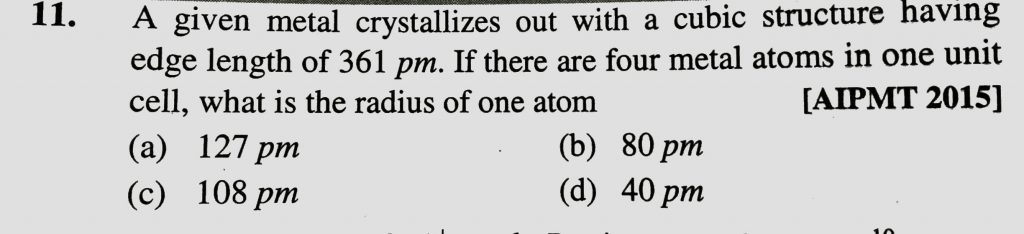 A given metal crystallizes out with a cubic structure having edge of 361 pm. If there are four metal atoms in one unit cell, what is the radius of one atom A given metal crystallizes out with a cubic structure having edge of 361 pm. If there are four metal atoms in one unit cell what is the radius of one atom December 16, 2020 Category: Uncategorised (JEE Advanced Physics by BM Sharma + GMP Solutions) , Facebook Messenger WhatsApp Share this:TwitterFacebook Related