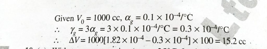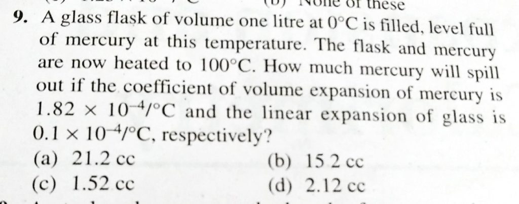 A glass flask of volume one litre at 0∘C is filled, level full of mercury at this temperature. The flask and mercury are now heated to 100∘C. How much mercury will spill out if coefficient of volume expansion of mercury is 1.82 × 10^−4/∘C and linear expansion of glass is 0.1 × 10^−4/∘C respectively?