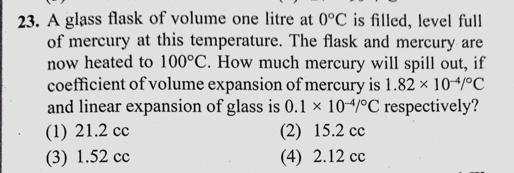 A glass flask of volume one litre at 0 C is filled, level full of mercury at this temperature. The flask and mercury are now heated to 100 C. How much mercury will spill out, if coefficient A glass flask of volume one litre at 0 C is filled if coefficient level full of mercury at this temperature. The flask and mercury are now heated to 100 C. How much mercury will spill out October 23, 2020 Category: Uncategorised (JEE Advanced Physics by BM Sharma + GMP Solutions) , Facebook Messenger WhatsApp Share this:TwitterFacebook Related