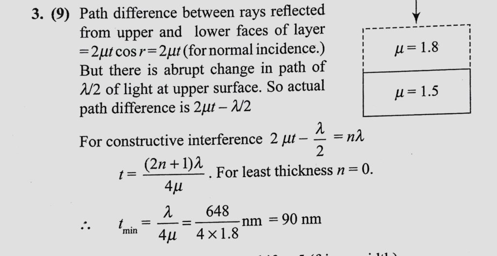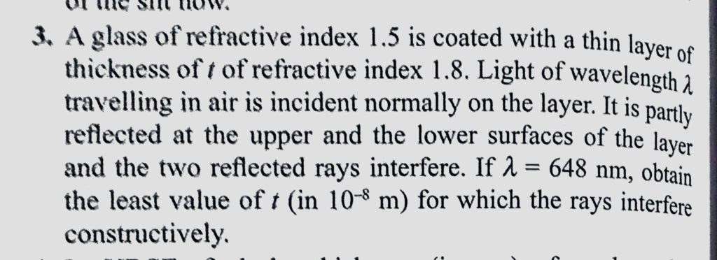 A glass of refractive index 1.5 is coated with a thin layer of thickness of t of refractive index 1.8. Light of wavelength lemda travelling in air is incident normally on the layer. It is partly A glass of refractive index 1.5 is coated with a thin layer of thickness of t of refractive index 1.8. Light of wavelength lemda travelling in air is incident normally on the layer. It is partly October 11, 2020 Category: Uncategorised (JEE Advanced Physics by BM Sharma + GMP Solutions) , Facebook Messenger WhatsApp Share this:TwitterFacebook Related