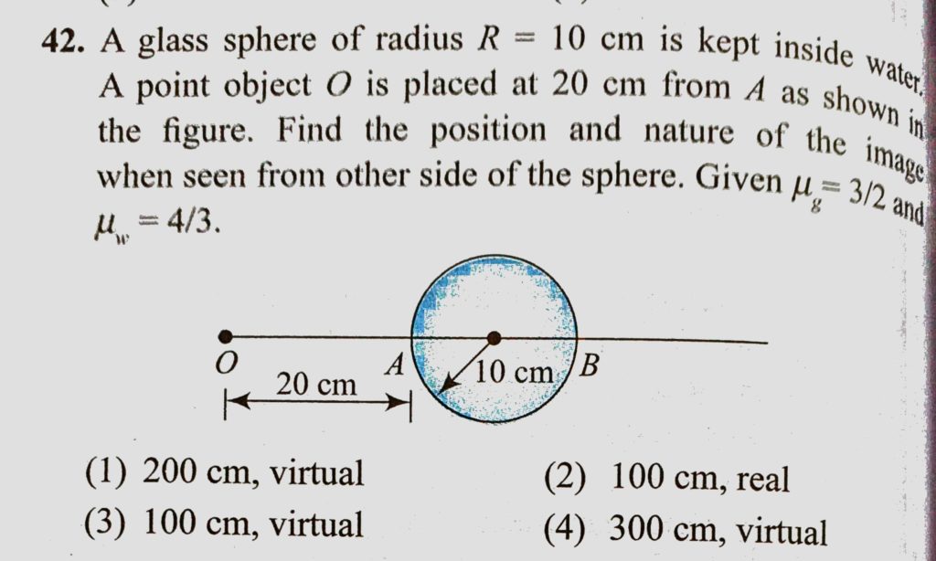 A glass sphere of radius R = 10 cm is kept inside water. A point object O is placed at 20 cm from A as shown in the figure. Find the position and nature of the image when seen from A glass sphere of radius R = 10 cm is kept inside water. A point object O is placed at 20 cm from A as shown in the figure. Find the position and nature of the image when seen from October 8, 2020 Category: Uncategorised (JEE Advanced Physics by BM Sharma + GMP Solutions) , Facebook Messenger WhatsApp Share this:TwitterFacebook Related