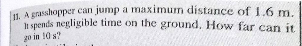A grasshopper can jump a maximum distance of 1.6 m. It spends negligible time on the ground. How far can it go in 10 s? A grasshopper can jump a maximum distance of 1.6 m. It spends negligible time on the ground. How far can it go in 10 s? September 21, 2020 Category: Uncategorised (JEE Advanced Physics by BM Sharma + GMP Solutions) , Facebook Messenger WhatsApp Share this:TwitterFacebook Related