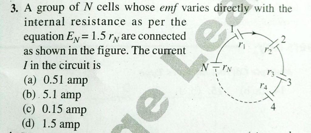 A group of N cells whose emf varies directly with the internal resistance as per the equation En = 1.5 rn are connected as shown in the figure. The current I in the circuit is A group of N cells whose emf varies directly with the internal resistance as per the equation En = 1.5 rn are connected as shown in the figure. The current I in the circuit is September 19, 2020 Category: Uncategorised (JEE Advanced Physics by BM Sharma + GMP Solutions) , Facebook Messenger WhatsApp Share this:TwitterFacebook Related