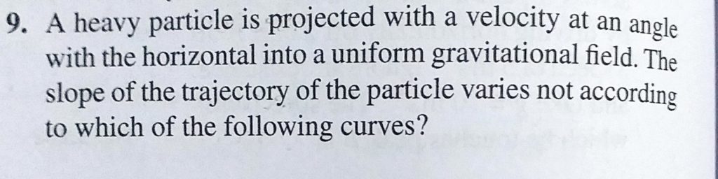 A heavy particle is projected with a velocity at an angle with the horizontal into a uniform gravitational field. The slope of the trajectory of the particle varies not according to which of the following curves? All the particles thrown with same initial velocity would strike the ground. a. with same speed b. simultaneously c. time would be least for the particle thrown with velocity v downward i.e. particle 1 September 24, 2020 Category: Uncategorised (JEE Advanced Physics by BM Sharma + GMP Solutions) , Facebook Messenger WhatsApp Share this:TwitterFacebook Related