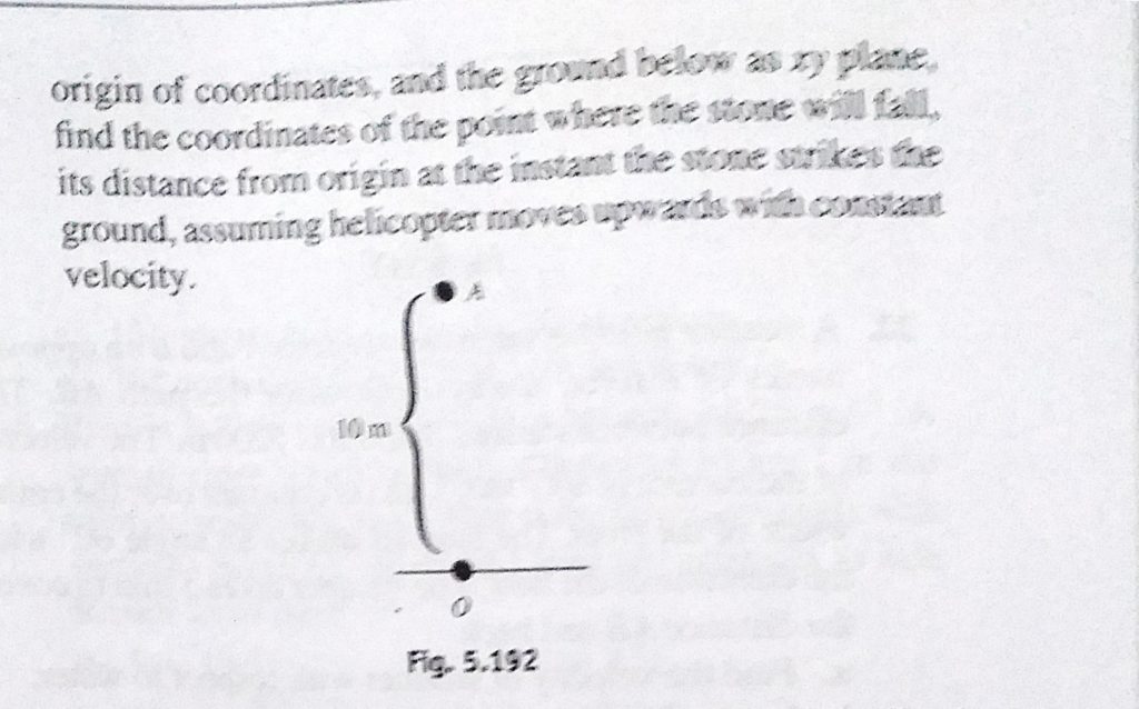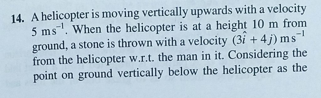 A helicopter is moving vetically upwards with a velocity 5 m/s. When the helicopter is at a height 10 m from ground, a stone is thrown with a velocity (3i + 4j) m/s from the helicopter A helicopter is moving vetically upwards with a velocity 5 m/s. When the helicopter is at a height 10 m from ground a stone is thrown with a velocity (3i + 4j) m/s from the helicopter September 22, 2020 Category: Uncategorised (JEE Advanced Physics by BM Sharma + GMP Solutions) , Facebook Messenger WhatsApp Share this:TwitterFacebook Related