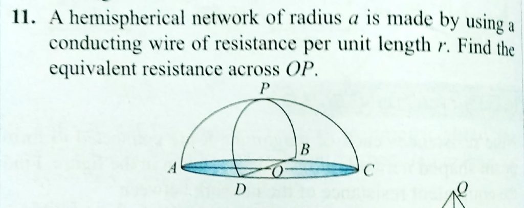 A hemispherical network of radius a is made by using a conducting wire of resistance per unit length r. Find the equivalent resistance across OP. A hemispherical network of radius a is made by using a conducting wire of resistance per unit length r. Find the equivalent resistance across OP. November 10, 2020 Category: Uncategorised (JEE Advanced Physics by BM Sharma + GMP Solutions) , Facebook Messenger WhatsApp Share this:TwitterFacebook Related