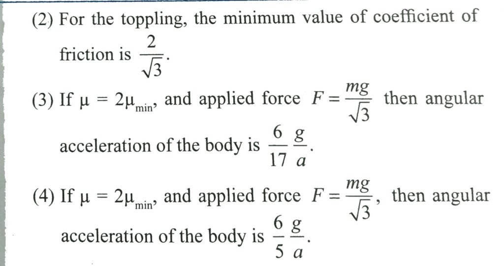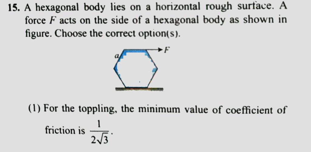 A hexagon body lies on a horizontal rough surface. A force F acts on the side of a hexagonal body as shown in figure. Choose the correct options. A hexagon body lies on a horizontal rough surface. A force F acts on the side of a hexagonal body as shown in figure. Choose the correct options. September 26, 2020 Category: Uncategorised (JEE Advanced Physics by BM Sharma + GMP Solutions) , Facebook Messenger WhatsApp Share this:TwitterFacebook Related