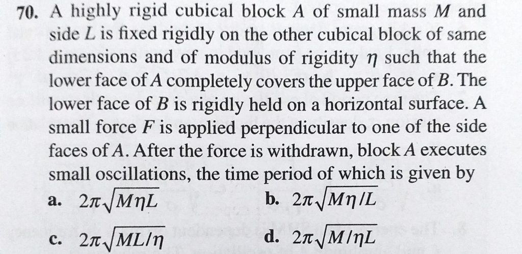 A highly rigid cubical block A of small mass M and side L is fixed rigidly on the other cubical block of same dimensions and of modulus of rigidity n such that the lower face of A completely covers the upper face of B. The and g is the acceleration due to gravity. r is the radius of the curve The relation tan theta = v^2 /rg gives the angle of banking of the cyclist going round the curve. Here v is the speed of the cyclist September 15, 2020 Category: Uncategorised (JEE Advanced Physics by BM Sharma + GMP Solutions) , Facebook Messenger WhatsApp Share this:TwitterFacebook Related