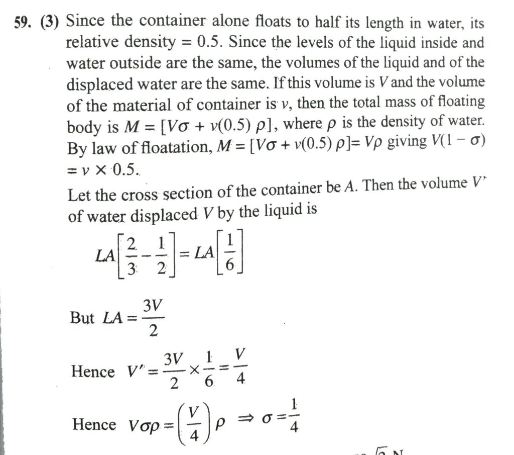 A hollow cylindrical container floats in water with half its length immersed. A liquid of specific gravity σ is slowly poured into the container until the levels of the liquid inside the container and of water outside are the same. It is observed that the container is submerged to two-thirds its length. Then the value of σ is