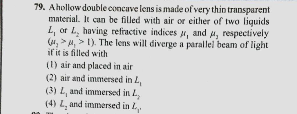 A hollow double concave lens is made of very thin transparent material. It can be filled with air or either of two liquids L1 and L2 having refractive indices mu 1 and mu 2 respectively A hollow double concave lens is made of very thin transparent material. It can be filled with air or either of two liquids L1 and L2 having refractive indices mu 1 and mu 2 respectively October 8, 2020 Category: Uncategorised (JEE Advanced Physics by BM Sharma + GMP Solutions) , Facebook Messenger WhatsApp Share this:TwitterFacebook Related