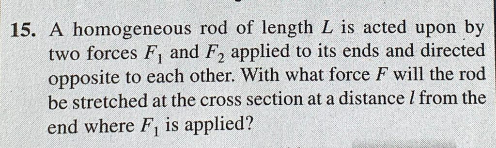 A homogeneous rod of length L is acted upon by two forces F1 and F2 applied to its ends and directed opposite to each other. With what force F will the rod be stretched at the cross section A homogeneous rod of length L is acted upon by two forces F1 and F2 applied to its ends and directed opposite to each other. With what force F will the rod be stretched at the cross section September 25, 2020 Category: Uncategorised (JEE Advanced Physics by BM Sharma + GMP Solutions) , Facebook Messenger WhatsApp Share this:TwitterFacebook Related