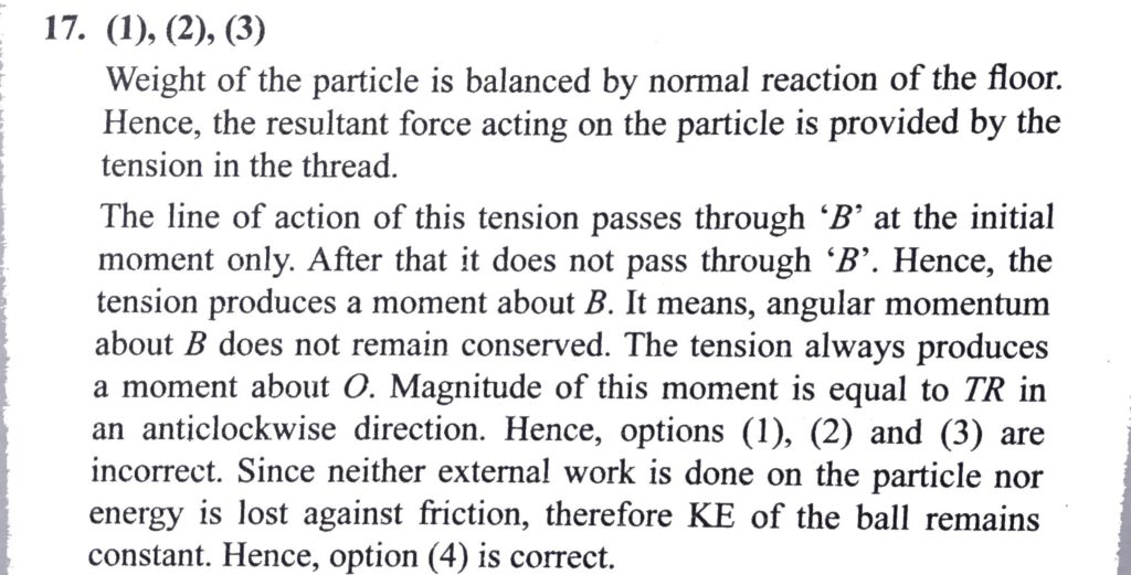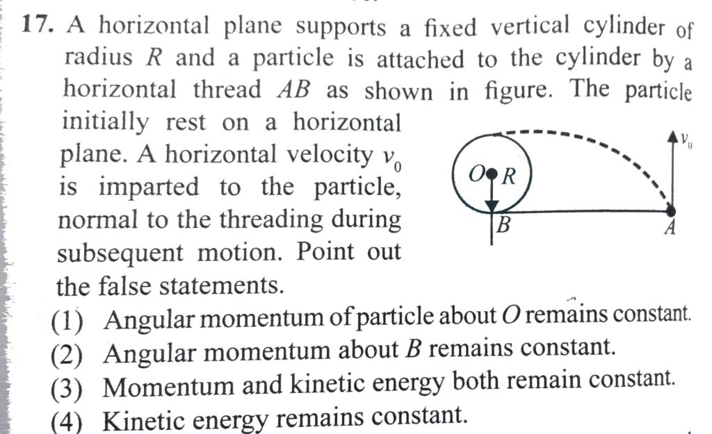 A horizontal plane supports a fixed vertical cylinder of radius R and a particle is attached to the cylinder by a horizontal thread AB as shown in the figure. The particle initially rest on horizontal plane. A horizontal velocity v 0 is imparted to the particle, normal to the threading during subsequent motion. Point out the false statements: