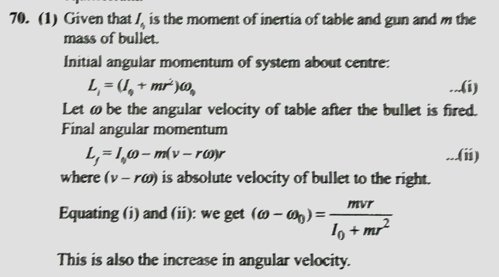 A horizontal turn table in the form of a disc of radius r carries a gun at G and rotates with angular velocity ω0 about a vertical axis passing through the centre O. The increase in angular velocity of the system if the gun fires a bullet of mass m with a tangential velocity v with respect to the gun is (moment of inertia of gun + table about O is I0