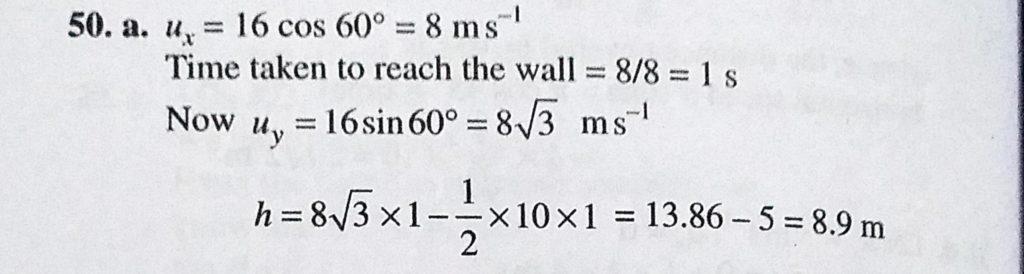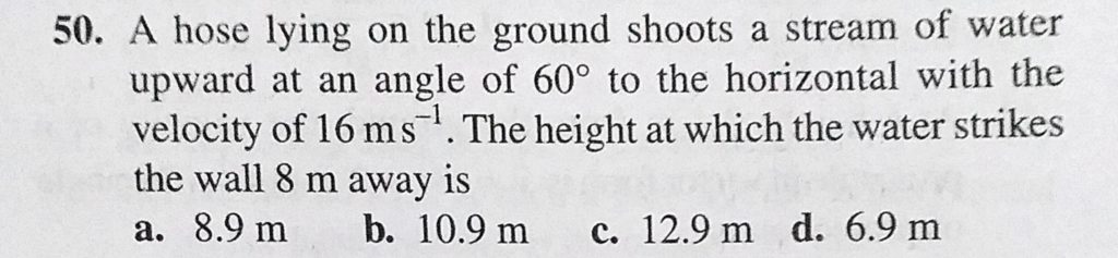 A hose lying on the ground shoots a stream of water upward at an angle of 60 to the horizontal with the velocity of 16 m/s. The height at which the water strikes the wall 8 m away is A hose lying on the ground shoots a stream of water upward at an angle of 60 to the horizontal with the velocity of 16 m/s. The height at which the water strikes the wall 8 m away is September 22, 2020 Category: Uncategorised (JEE Advanced Physics by BM Sharma + GMP Solutions) , Facebook Messenger WhatsApp Share this:TwitterFacebook Related
