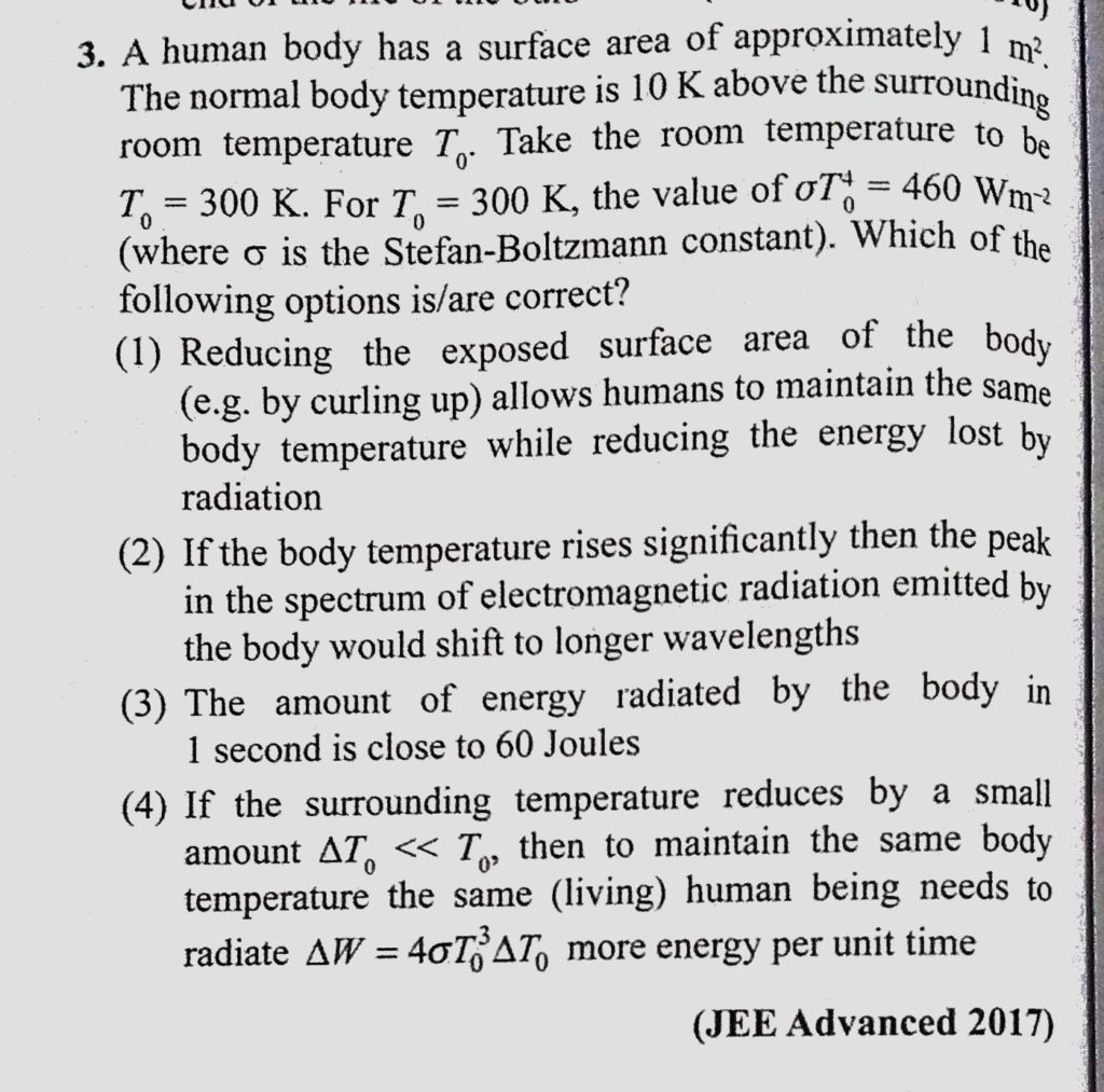 A human body has a surface area of approximately 1 m^2. The normal body temperature is 10 K above the surrounding room temperature T0. Take the room temperature to be A human body has a surface area of approximately 1 m^2. The normal body temperature is 10 K above the surrounding room temperature T0. Take the room temperature to be October 27, 2020 Category: Uncategorised (JEE Advanced Physics by BM Sharma + GMP Solutions) , Facebook Messenger WhatsApp Share this:TwitterFacebook Related