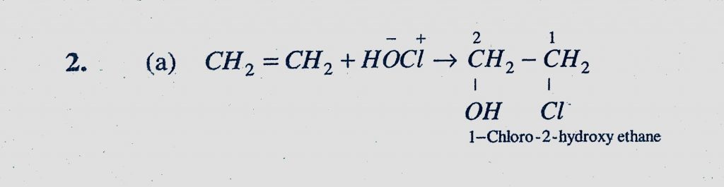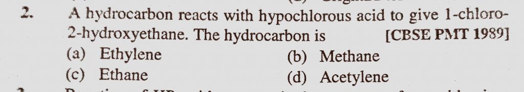 A hydrocarbon reacts with hypochlorous acid to give 1-chloro-2-hydroxyethane. The hydrocarbon is (a) Ethylene (b) Methane (c) Ethane (d) Acetylene A hydrocarbon reacts with hypochlorous acid to give 1-chloro-2-hydroxyethane. The hydrocarbon is (a) Ethylene (b) Methane (c) Ethane (d) Acetylene December 13, 2020 Category: Uncategorised (JEE Advanced Physics by BM Sharma + GMP Solutions) , Facebook Messenger WhatsApp Share this:TwitterFacebook Related