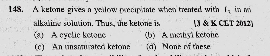 A ketone gives a yellow precipitate when treated with I2 in an alkaline solution. Thus, the ketone is (a) A cyclic ketone (b) A methyl ketone (c) An unsaturated ketone A ketone gives a yellow precipitate when treated with I2 in an alkaline solution. Thus the ketone is (a) A cyclic ketone (b) A methyl ketone (c) An unsaturated ketone February 12, 2021 Category: Uncategorised (JEE Advanced Physics by BM Sharma + GMP Solutions) , Facebook Messenger WhatsApp Share this:TwitterFacebook Related
