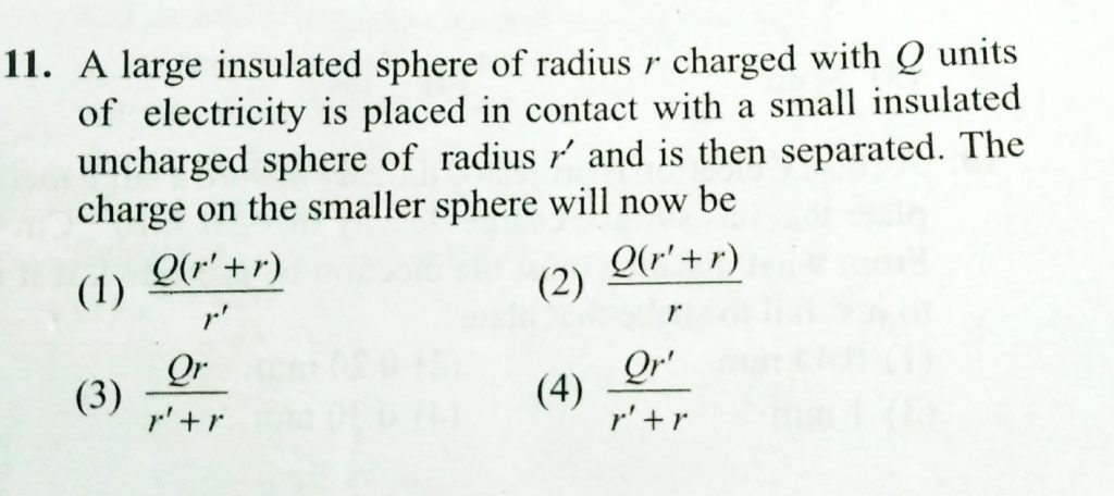 A large insulated sphere of radius r changed with Q units of electricity is placed in contact with a small insulated uncharged sphere of radius r’ and is then seperated . The charge on the smaller sphere will now be the corresponding work done is V' . Then the work done is slowly shiffting a unit positive charge from infinity to P is V . If the pendulum is free to move When the positively charged hanging pendulum bob is made fixed November 5, 2020 Category: Uncategorised (JEE Advanced Physics by BM Sharma + GMP Solutions) , Facebook Messenger WhatsApp Share this:TwitterFacebook Related