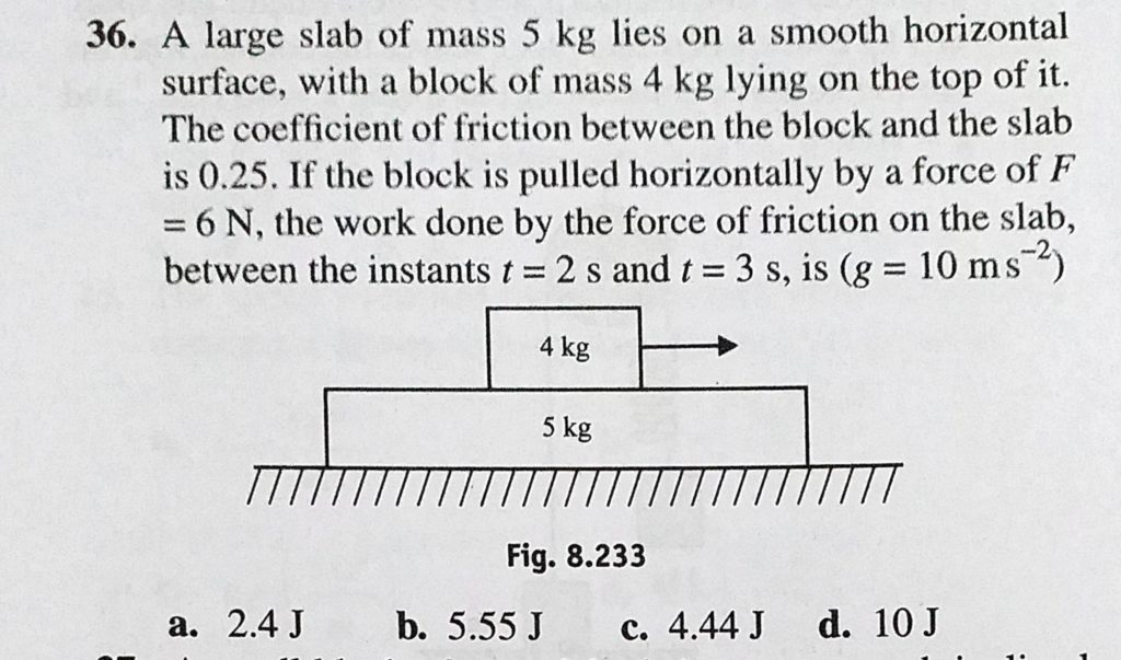 A large slab of mass 5 kg lies on a smooth horizontal surface, with a block of mass 4 kg lying on the top of it. The coefficient of friction between the block and the slab is 0.25. If the block A large slab of mass 5 kg lies on a smooth horizontal surface with a block of mass 4 kg lying on the top of it. The coefficient of friction between the block and the slab is 0.25. If the block October 4, 2020 Category: Uncategorised (JEE Advanced Physics by BM Sharma + GMP Solutions) , Facebook Messenger WhatsApp Share this:TwitterFacebook Related