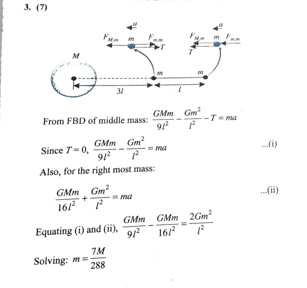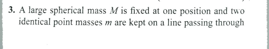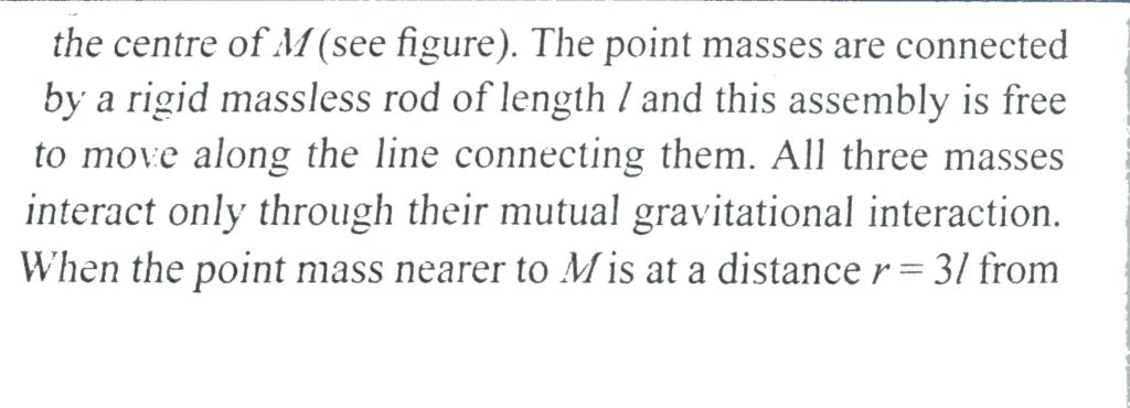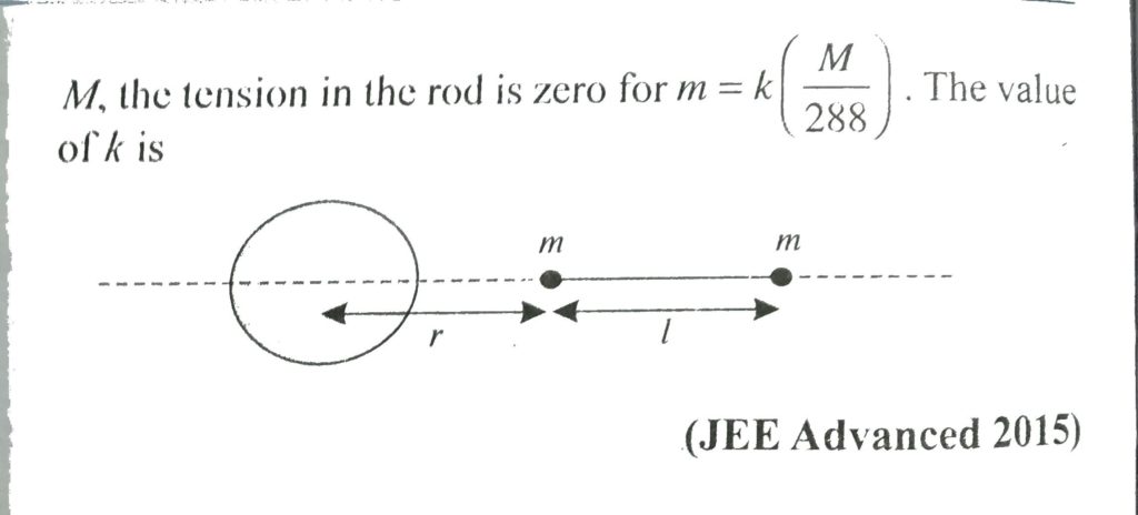 A larger spherical mass M is fixed at one position and two identical point masses m are kept on a line passing through the centre of M. The point masses are connected by rigid massless rod of length l and this assembly is free to move along the line connecting them. All three masses interact only throght their mutual gravitational interaction. When the point mass nearer to M is at a distance r = 3 l form M, the tension in the rod is zero for m = k( M/288 ). The value of k is