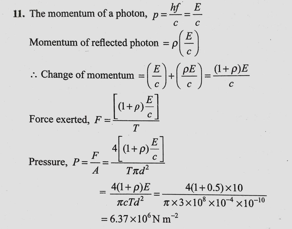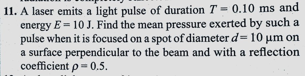 A laser emits a light pulse of duration T = 0.10 ms and energy E = 10 J. Find the mean pressure exerted by such a pulse when it is focused on a spot of diameter d = 10 mu m on A laser emits a light pulse of duration T = 0.10 ms and energy E = 10 J. Find the mean pressure exerted by such a pulse when it is focused on a spot of diameter d = 10 mu m on October 12, 2020 Category: Uncategorised (JEE Advanced Physics by BM Sharma + GMP Solutions) , Facebook Messenger WhatsApp Share this:TwitterFacebook Related