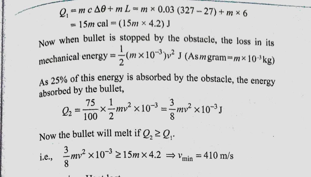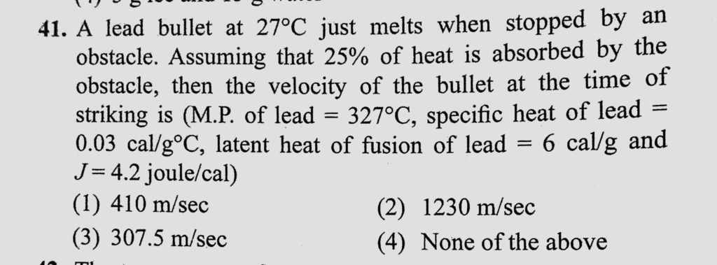 A lead bullet at 27 C just melts when stopped by an obstacle. Assuming that 25% of heat is absorbed by the obstacle, then the velocity of the bullet at the time of striking is A lead bullet at 27 C just melts when stopped by an obstacle. Assuming that 25% of heat is absorbed by the obstacle then the velocity of the bullet at the time of striking is October 23, 2020 Category: Uncategorised (JEE Advanced Physics by BM Sharma + GMP Solutions) , Facebook Messenger WhatsApp Share this:TwitterFacebook Related