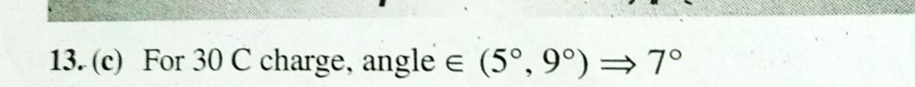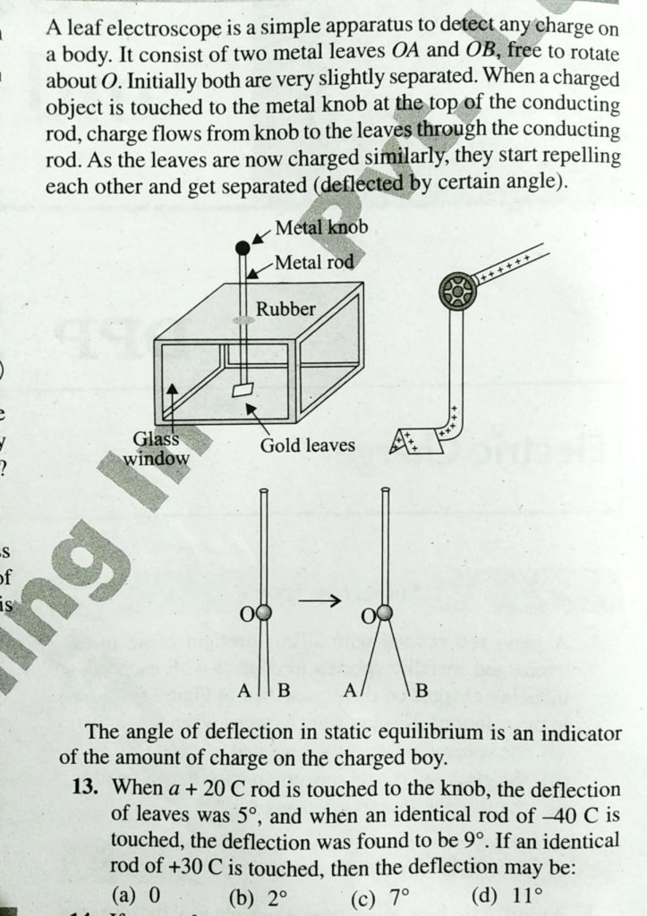 A leaf electroscope is a simple apparatus to detect any charge on a body. It consist of two metal leaves OA and OB, free to rotate about O. Initially both are very slighty separted. When a charged object is touched to the metal knob at the top of the conduction re, charge flows from knob to the top of the conduction rod, charge flows from knob to the leaves through the conducting rod, charge flows from knob to the leaves through the conduction rod. As the leaves are now charged similarly, they start repelling each other and tet separted (deflected by certain angle). The angle of deflection in static equilibrium is an indicator of the amount of charge on the charged boy. When a+20C rod is touched to the knob, the deflection of leaves was 5∘, and when an identical rod of −40C is touched, the deflection was found to be 9∘. If an identical rod of +30 C is touched, then the deflection may be: