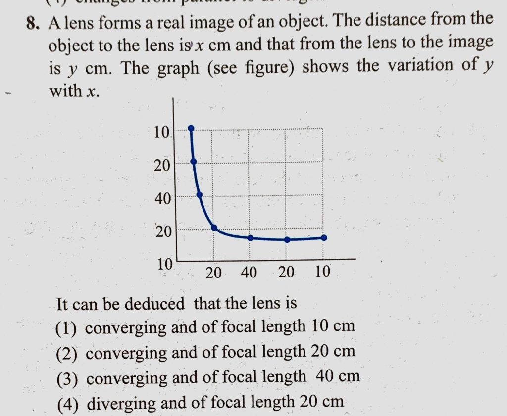 A lens forms a real image of an object. The distance from the object to the lens is x cm and that from the lens to the image is y cm. The graph (see figure) shows the variation A lens forms a real image of an object. The distance from the object to the lens is x cm and that from the lens to the image is y cm. The graph (see figure) shows the variation October 8, 2020 Category: Uncategorised (JEE Advanced Physics by BM Sharma + GMP Solutions) , Facebook Messenger WhatsApp Share this:TwitterFacebook Related