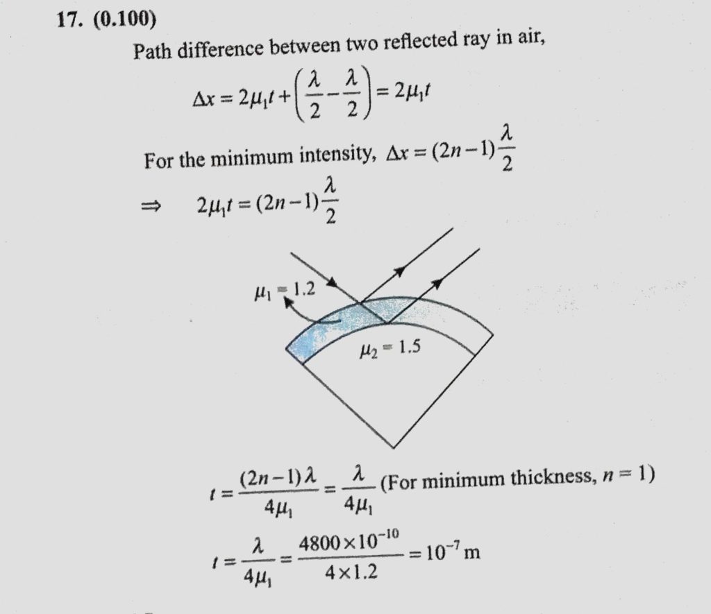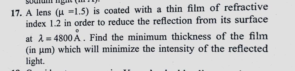A lens (mu = 1.5) is coated with a thin film of refractive index 1.2 in order to reduce the reflection from its surface at lemda = 4800 A. Find the minimum thickness of the film (in mu m) which A lens (mu = 1.5) is coated with a thin film of refractive index 1.2 in order to reduce the reflection from its surface at lemda = 4800 A. Find the minimum thickness of the film (in mu m) which October 11, 2020 Category: Uncategorised (JEE Advanced Physics by BM Sharma + GMP Solutions) , Facebook Messenger WhatsApp Share this:TwitterFacebook Related