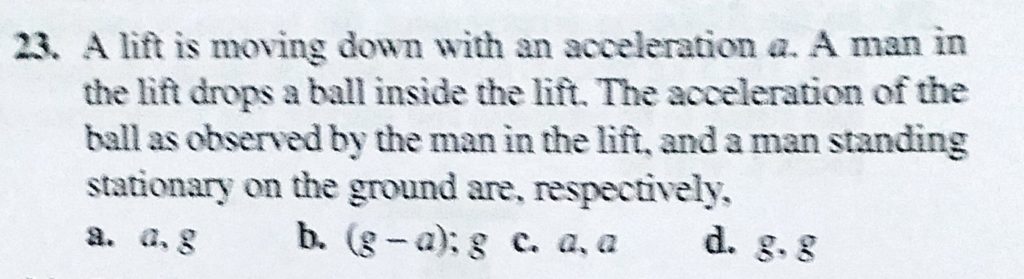 A lift is moving down with an acceleration a. A man in the lift drops a ball inside the lift. The acceleration of the ball as observed by the man in the lift, and a man standing stationary on the ground A lift is moving down with an acceleration a. A man in the lift drops a ball inside the lift. The acceleration of the ball as observed by the man in the lift and a man standing stationary on the ground September 29, 2020 Category: Uncategorised (JEE Advanced Physics by BM Sharma + GMP Solutions) , Facebook Messenger WhatsApp Share this:TwitterFacebook Related