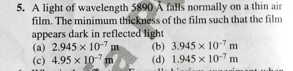 A light of wave length 5890 A falls normally on a thin air flim. The minimum thickness of the flim such that the flim appears dark in reflected light A light of wave length 5890 A falls normally on a thin air flim. The minimum thickness of the flim such that the flim appears dark in reflected light September 13, 2020 Category: Uncategorised (JEE Advanced Physics by BM Sharma + GMP Solutions) , Facebook Messenger WhatsApp Share this:TwitterFacebook Related