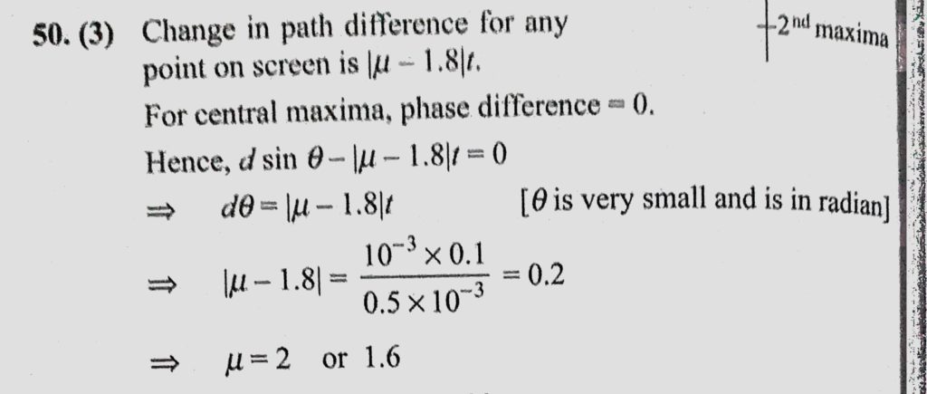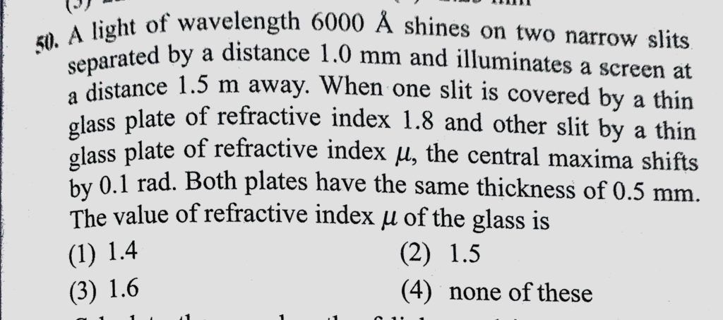 A light of wavelength 6000 A shines on two narrow slits separated by a distance 1.0 mm and illuminates a screen at a distance 1.5 m away. When one slit is covered by a thin glass plate A light of wavelength 6000 A shines on two narrow slits separated by a distance 1.0 mm and illuminates a screen at a distance 1.5 m away. When one slit is covered by a thin glass plate October 10, 2020 Category: Uncategorised (JEE Advanced Physics by BM Sharma + GMP Solutions) , Facebook Messenger WhatsApp Share this:TwitterFacebook Related
