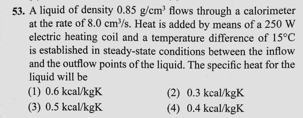 A liquid of density 0.85 g/cm^3 flows through a calorimeter at the rate of 8.0 cm^3/s. Heat is added by means of a 250 W electric heating coil and a temperature difference of 15 C is established A liquid of density 0.85 g/cm^3 flows through a calorimeter at the rate of 8.0 cm^3/s. Heat is added by means of a 250 W electric heating coil and a temperature difference of 15 C is established October 24, 2020 Category: Uncategorised (JEE Advanced Physics by BM Sharma + GMP Solutions) , Facebook Messenger WhatsApp Share this:TwitterFacebook Related