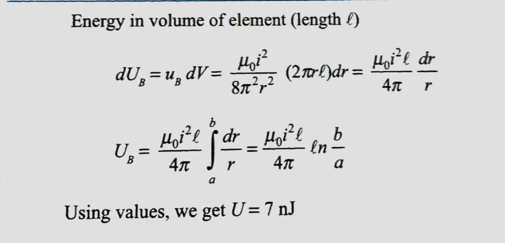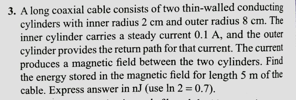 A long coaxial cable consists of two thin-walled conducting cylinder carries a steady current 0.1A, and the outer cylinder provides the return path for that current. The current produced a magnetic field between the two cylinders. Find the energy stored in the magnetic field for length 5 m of the cable. Express answer in Nj (use 1 n^2 = 0.7).