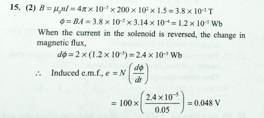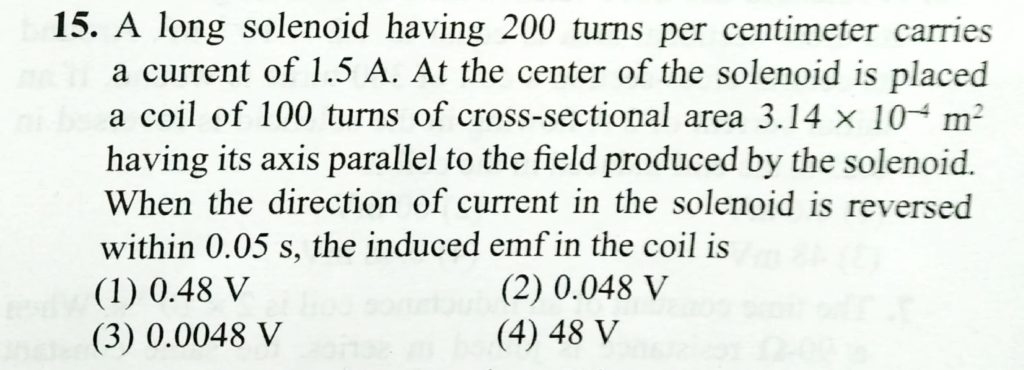 A long solenoid having 200 turns per centimeter carries a current of 1.5 A. At the center of the solenoid is placed a coil of 100 turns of cross-sectional area 3.14 × 10^−4 m^2 having its axis parallel to the field produced by the solenoid. When the direction of current in the solenoid is reversed within 0.05 s, the induced emf in the coil is