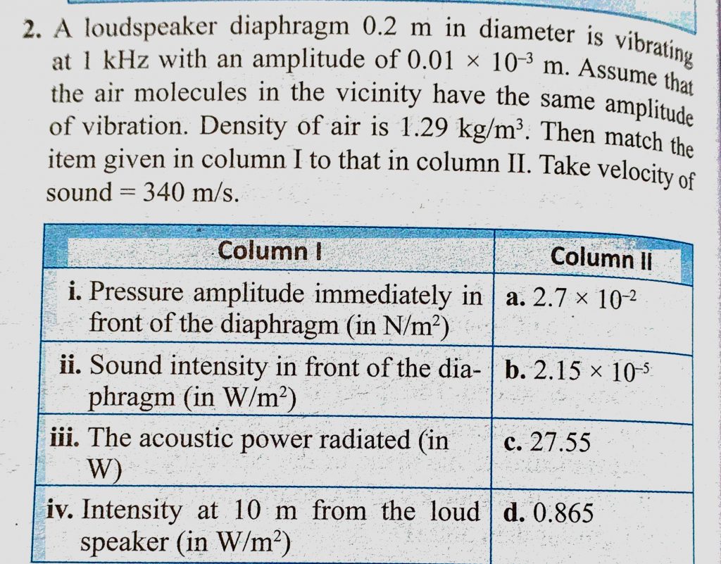 A loudspeaker diaphragm 0.2 m in diameter is vibrating at 1 kHz with an amplitude of 0.01 * 10^-3 m. Assume that the air molecules in the vicinity have the same amplitude of vibration. A loudspeaker diaphragm 0.2 m in diameter is vibrating at 1 kHz with an amplitude of 0.01 * 10^-3 m. Assume that the air molecules in the vicinity have the same amplitude of vibration. November 8, 2020 Category: Uncategorised (JEE Advanced Physics by BM Sharma + GMP Solutions) , Facebook Messenger WhatsApp Share this:TwitterFacebook Related