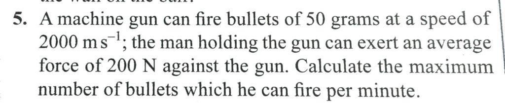 A machine gun can fire bullets of 50 grams at a Speed of 2000 m/s, the man holding the gun can exert an average force of 200N against the gun. Calculate the maximum number of bullets which he can fire per minute. A machine gun can fire bullets of 50 grams at a Speed of 2000 m/s the man holding the gun can exert an average force of 200N against the gun. Calculate the maximum number of bullets which he can fire per minute. September 22, 2020 Category: Uncategorised (JEE Advanced Physics by BM Sharma + GMP Solutions) , Facebook Messenger WhatsApp Share this:TwitterFacebook Related