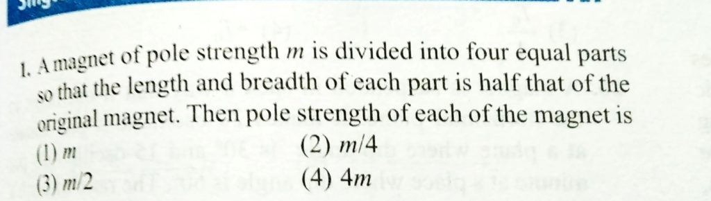 A magnet of pole strength m is divided into 4 equal parts so that the length and breadth of each part is half that of the original magnet. The pole strength of each of the magnet is A magnet of pole strength m is divided into 4 equal parts so that the length and breadth of each part is half that of the original magnet. The pole strength of each of the magnet is October 18, 2020 Category: Uncategorised (JEE Advanced Physics by BM Sharma + GMP Solutions) , Facebook Messenger WhatsApp Share this:TwitterFacebook Related